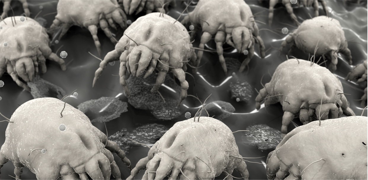 Halloween may be over, but there are certain creepy creatures that diligently remain year-round and commonly trigger allergy and asthma symptoms. Dust mites are eight-legged relatives ticks and spiders, have no eyes, have translucent bodies, and are microscopic, or too small to see with the unaided eye. These tiny creatures love to make their home on human and pet bedding, mattresses, carpets, curtains, toys and upholstered furniture. They love to choose these locations for their homes because of the plentiful food supply. Dust mites regularly feed on the dead flakes of skin that people and pets shed daily and gain their water from moisture found in their environment (think humidity and sweat!). They live somewhere between 60 and 100 days.